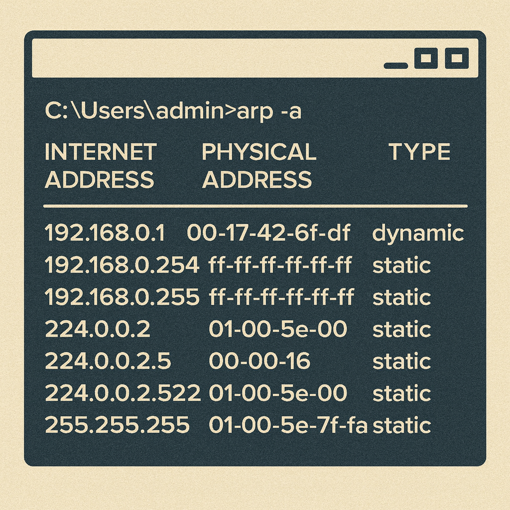 - ARPキャッシュ:一度調べた「IPアドレス ↔ MACアドレス」の対応を、一定時間だけ保存しておく仕組み。